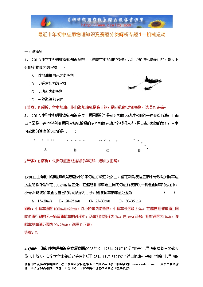 1.(2013中学生数理化潜能知识竞赛)下图是空中加油的情景,我们说加油机是静止的,是以下列哪个物体为参照物( )