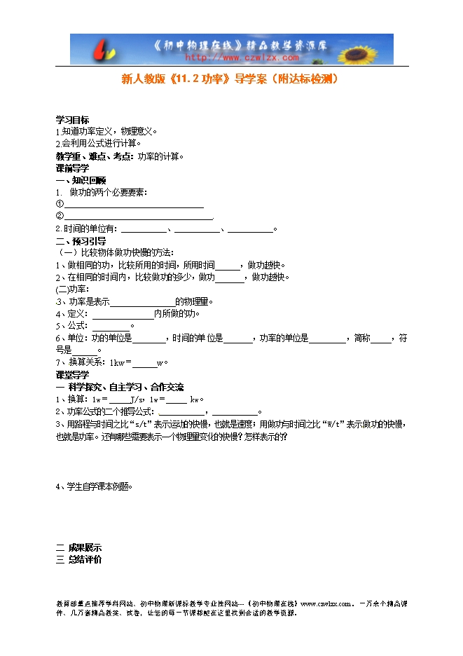6、单位:功的单位是________,时间的单 位是_______,功率的单位是_________,简称_____,符号是______。