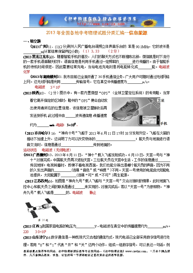(2013年湖南郴州)21.我市目前已全面开通了3G手机通信业务,广大用户可随时通过无线网络上网。这无线网络是利用 传输信号,它在真空中传播速度为 m/s。