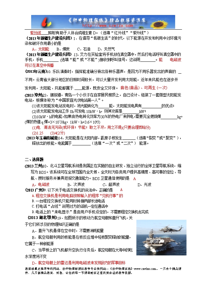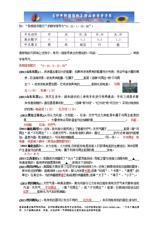 (2013广西柳州)13.2013年6月11日,“神十”载入飞船发射成功,6月13日,天宫一号与“神十”对接完成,中国航天员再次进驻天宫。三位航天员在天宫中生活、工作的信息通过_______传回地球;电视转播时,即便不看电视西面,我们也能分辨出是哪个航天员的声音,因为不同的入发出声音的__________(选填“音色”或“响度”)不同。天宫一号使用的电能由太阳能电池提供,太阳能属于_________(选填“可”或“不可”)再生能源。