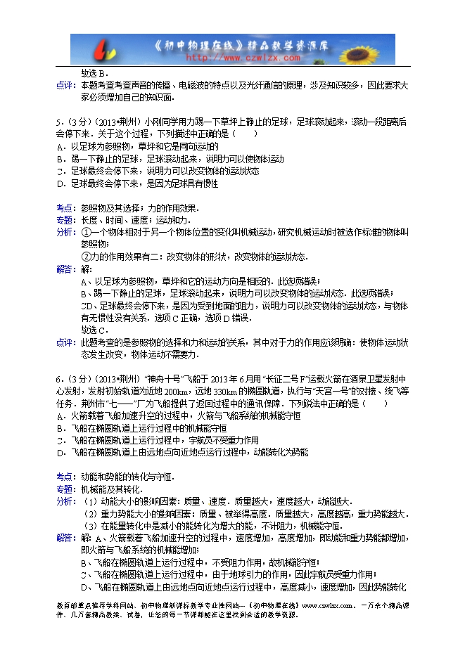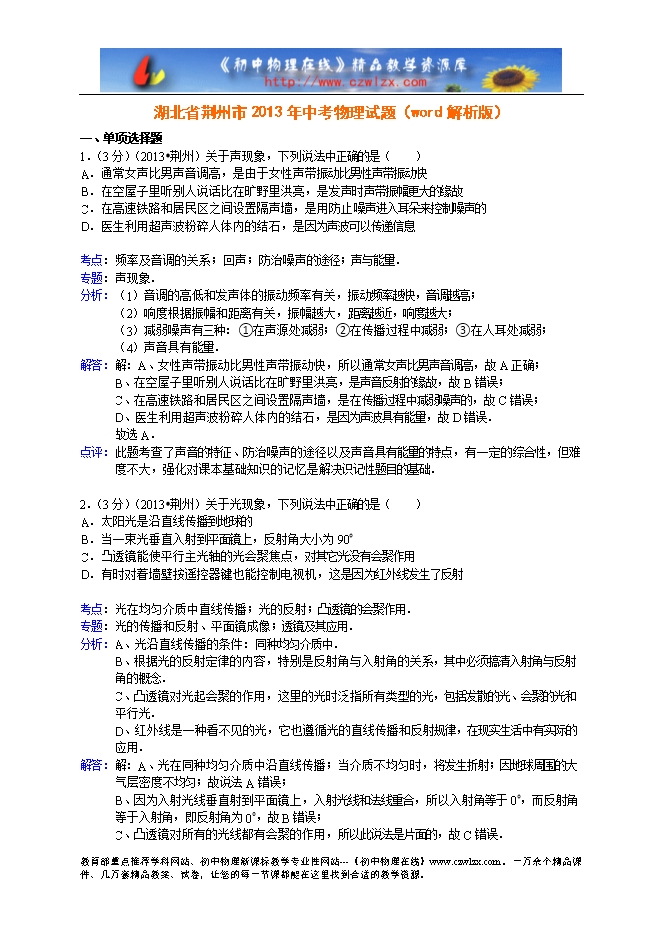 1.(3分)(2013•荆州)关于声现象,下列说法中正确的是( )