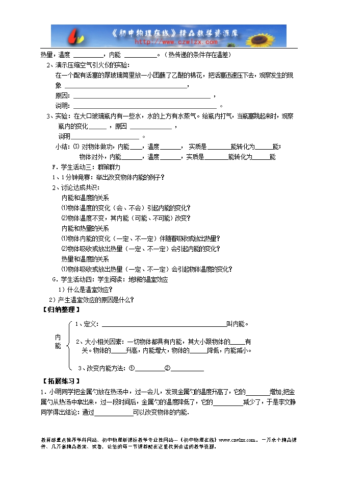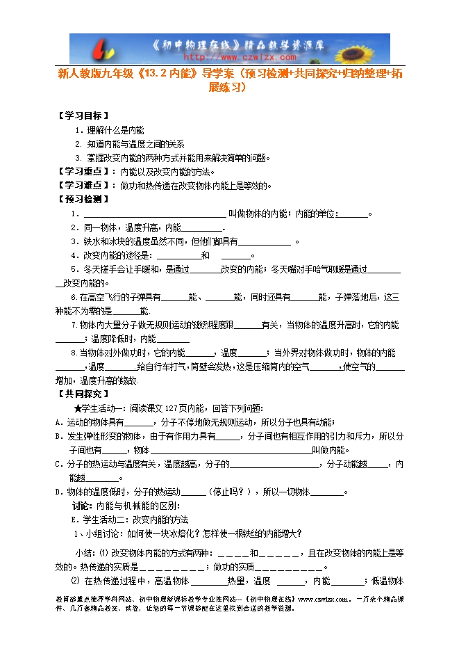 新人教版九年级《13.2内能》导学案(预习检测+共同探究+归纳整理+拓展练习)