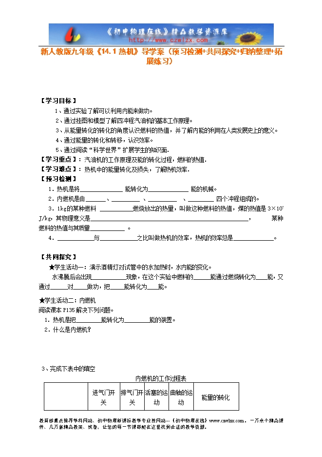 新人教版九年级《14.1热机》导学案(预习检测+共同探究+归纳整理+拓展练习)