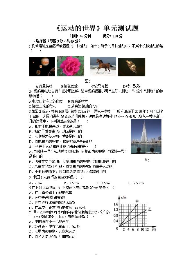 1.机械运动是自然界最普遍的一种运动,如图1所示的各种运动中,不属于机械运动的是( )