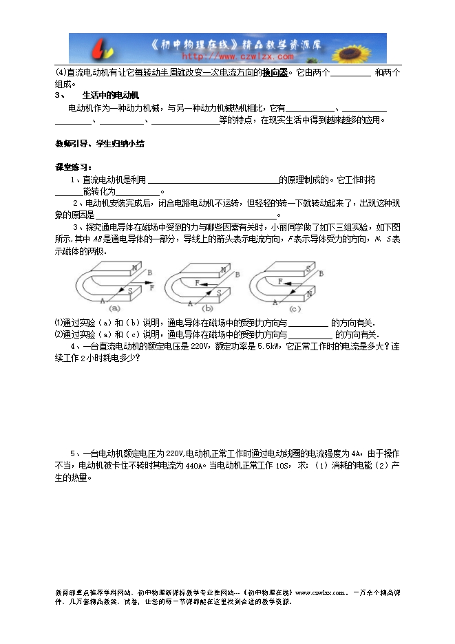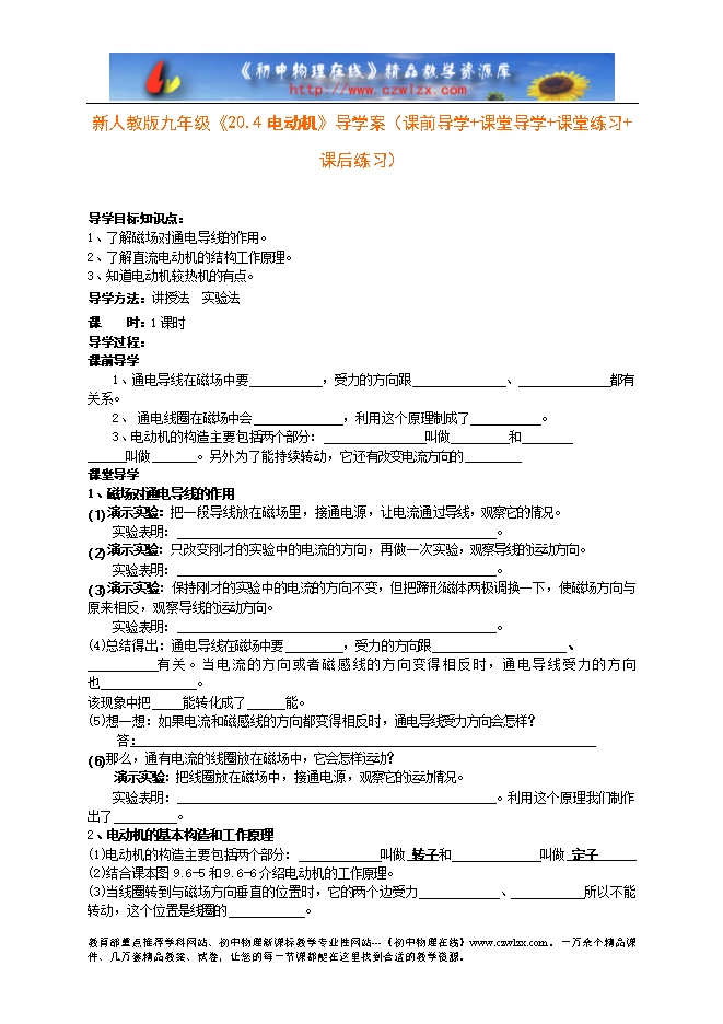 新人教版九年级《20.4电动机》导学案(课前导学+课堂导学+课堂练习+课后练习)