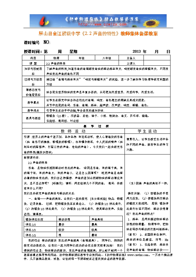 屏山县金江初级中学《2.2声音的特性》教师集体备课教案
