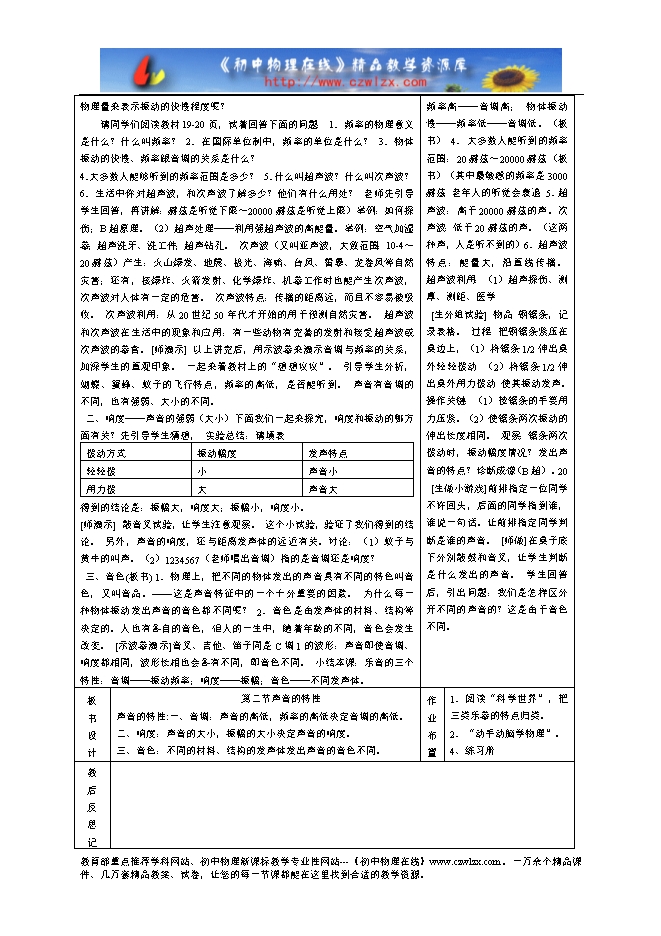 教学重点 让学生在探究中体会和总结出对音调、响度、音色概念的理解及其相关因素。