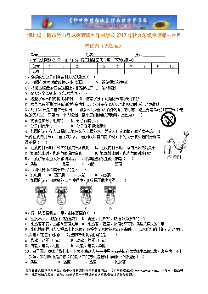 湖北省十堰市竹山县麻家渡镇九年制学校2013年秋九年级物理第一次月考试题(无答案)