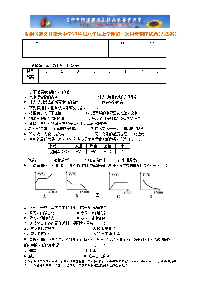 贵州省遵义县第六中学2014届九年级上学期第一次月考物理试题(无答案)