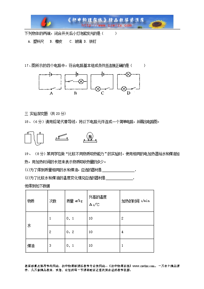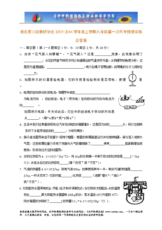 淮北市八校教研协会2013-2014学年度上学期九年级第一次月考物理试卷及答案