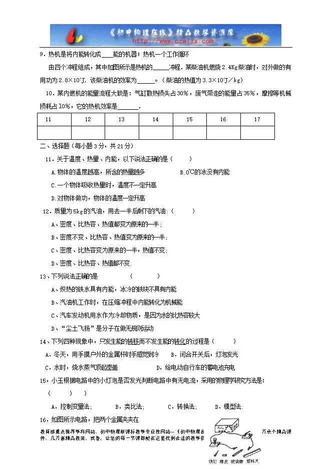 - 1131湖南省南县浪拔湖镇中学2014届九年级上学期第一次月考物理试题(无答案)