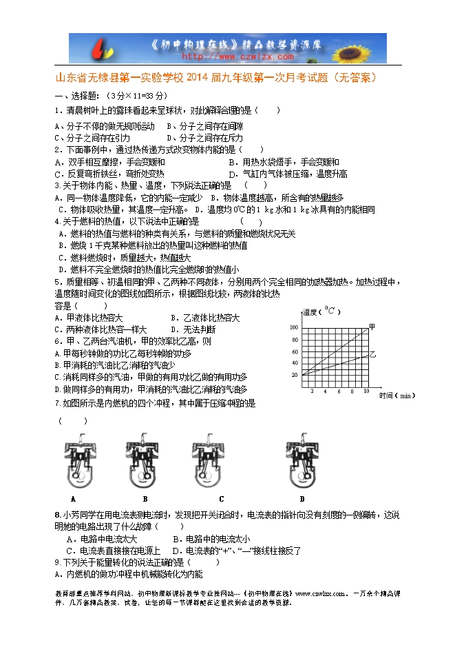 - 1432四川省资阳市青龙初中2014届九年级上学期第一次月考物理试题(无答案)