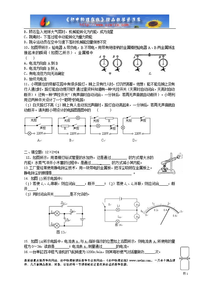 - 1977湖北省仙桃三中2013年秋九年级第一次月考物理模拟试题及答案