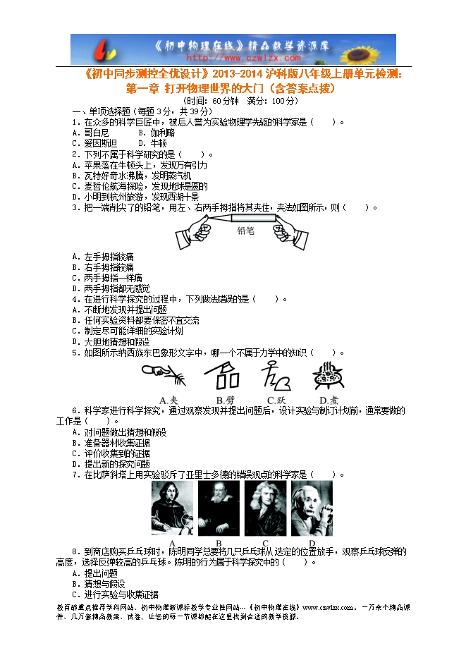 《初中同步测控全优设计》2013-2014沪科版八年级上册单元检测:第一章 打开物理世界的大门(含答案点拨)