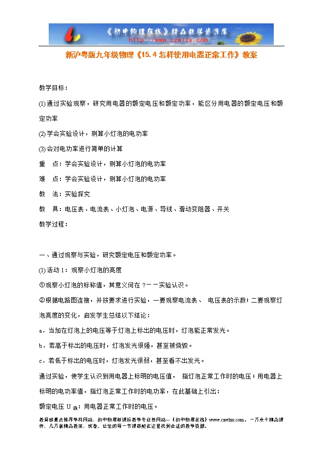 新沪粤版九年级物理《15.4怎样使用电器正常工作》教案
