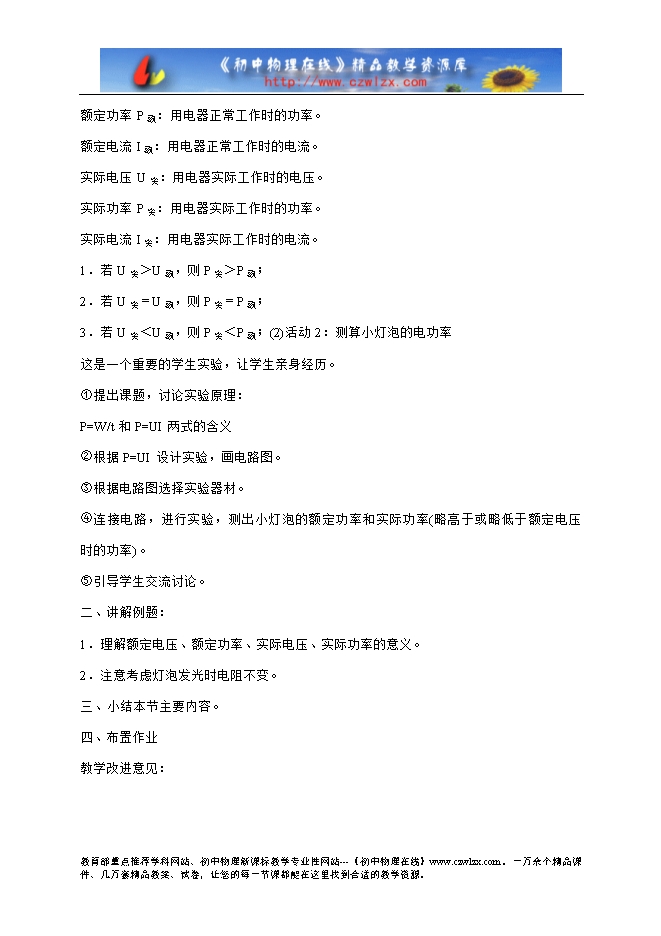 通过实验,使学生认识到用电器上标明的电压值,指灯泡正常工作时的电压;用电器上标明的电功率值,指灯泡正常工作时的电功率,在此基础上引出: