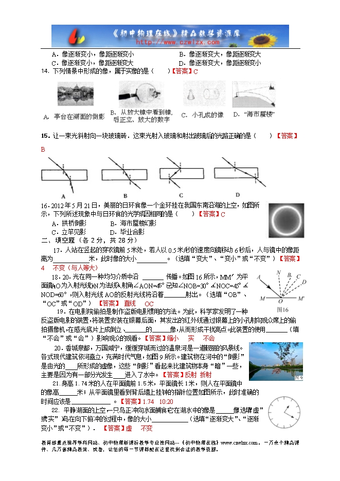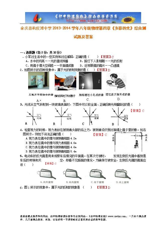 余庆县构皮滩中学2013-2014学年八年级物理第四章《多彩的光》综合测试题及答案