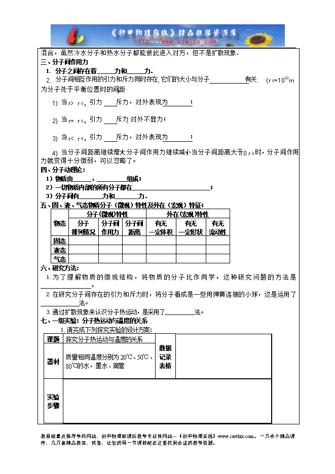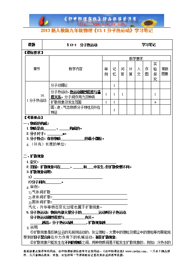 2013新人教版九年级物理《13.1分子热运动》学习笔记