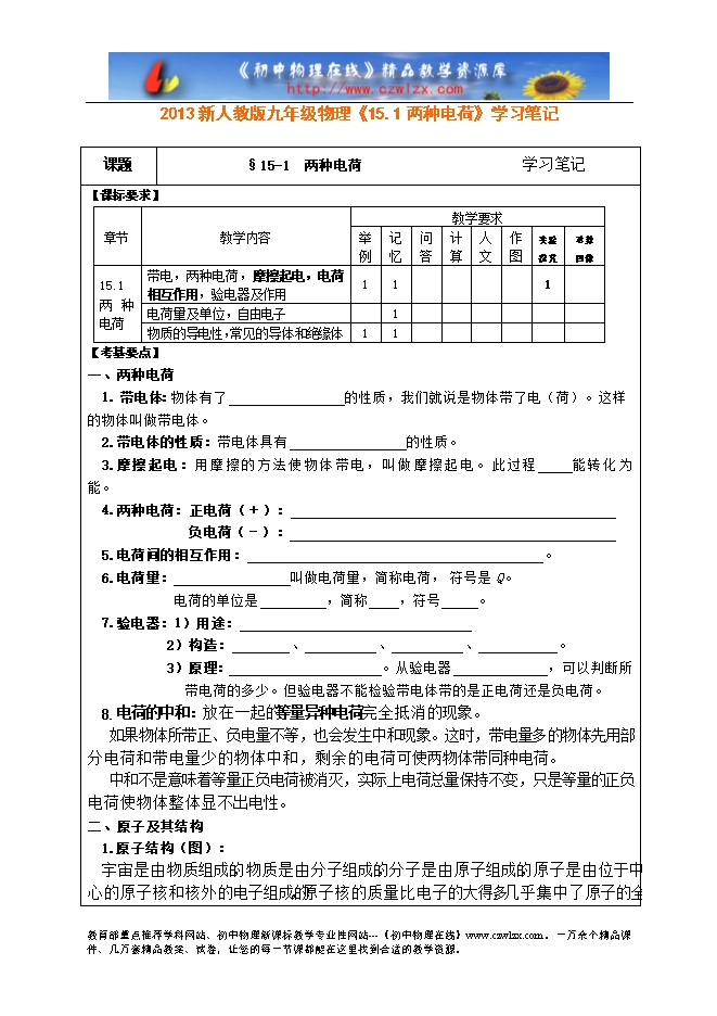 2013新人教版九年级物理《15.1两种电荷》学习笔记