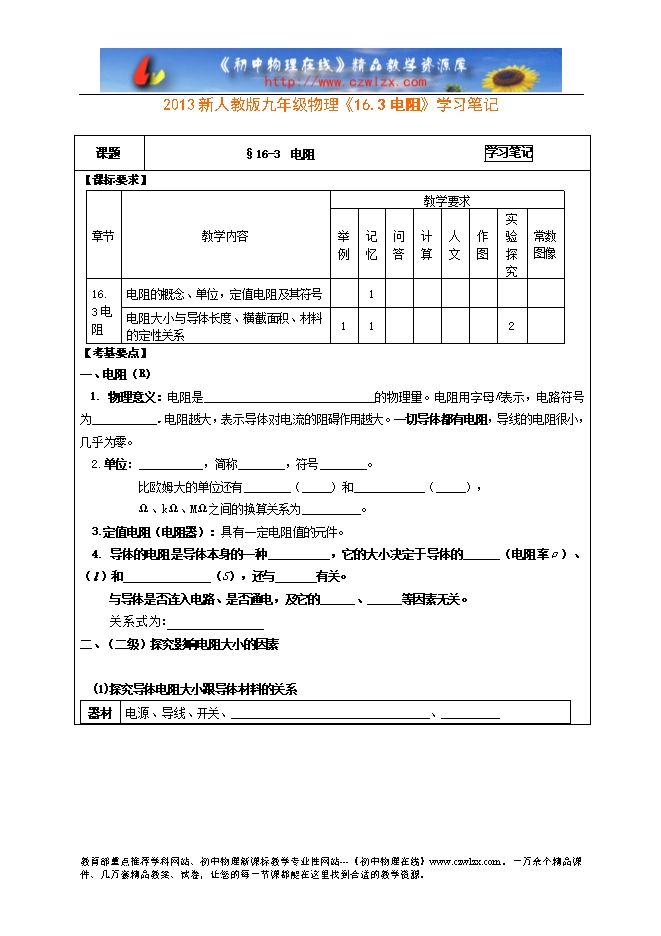 2013新人教版九年级物理《16.3电阻》学习笔记