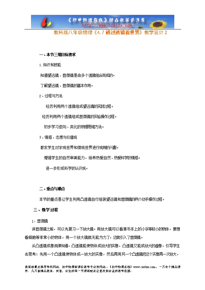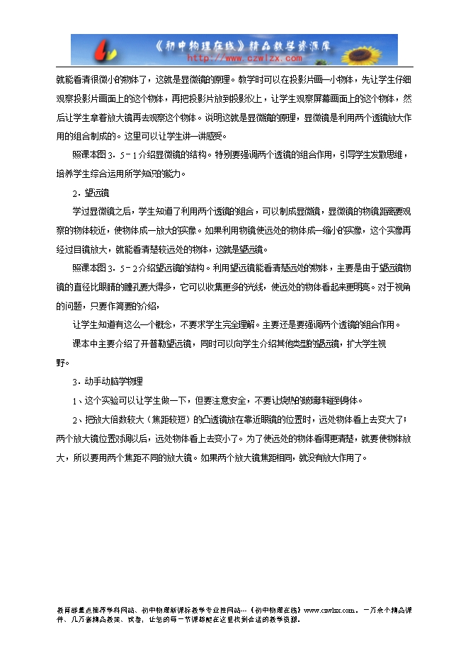 本节的重点是让学生利用凸透镜自行组装望远镜和显微镜的两个动手操作过程。