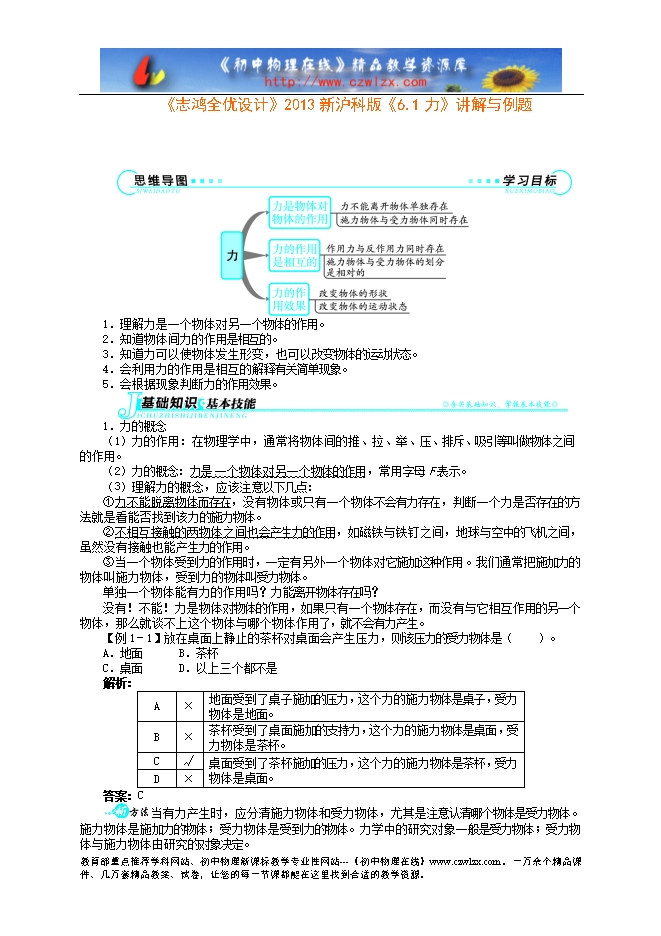 《志鸿全优设计》2013新沪科版《6.1力》讲解与例题