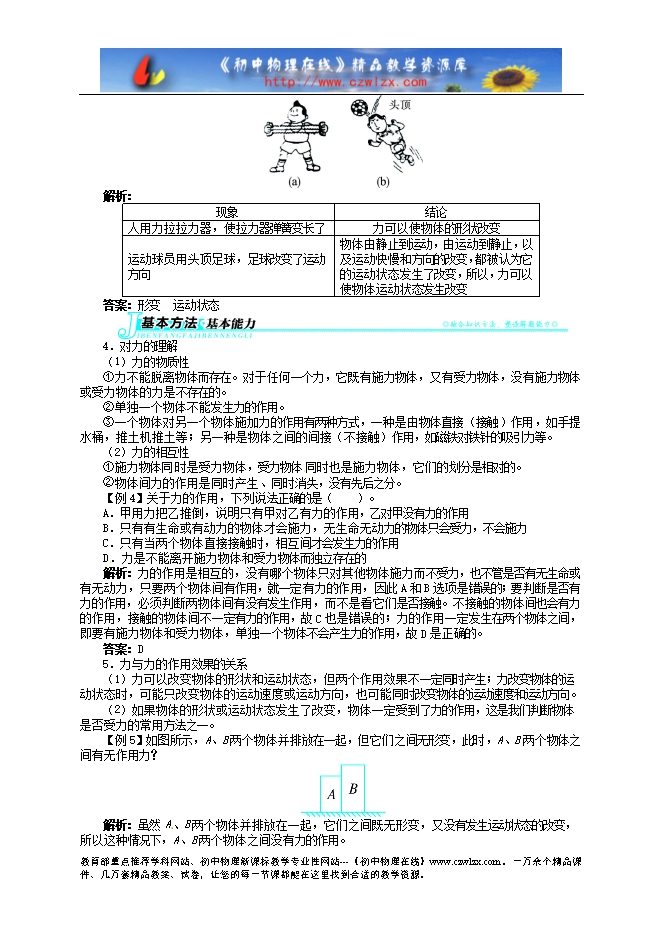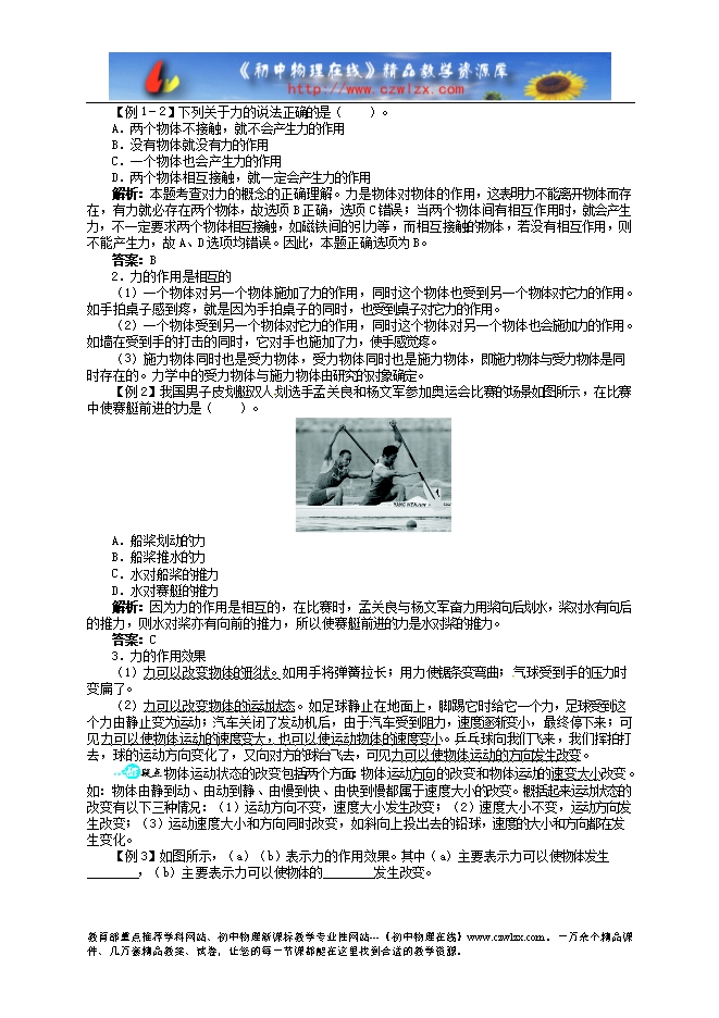 (1)力的作用:在物理学中,通常将物体间的推、拉、举、压、排斥、吸引等叫做物体之间的作用。