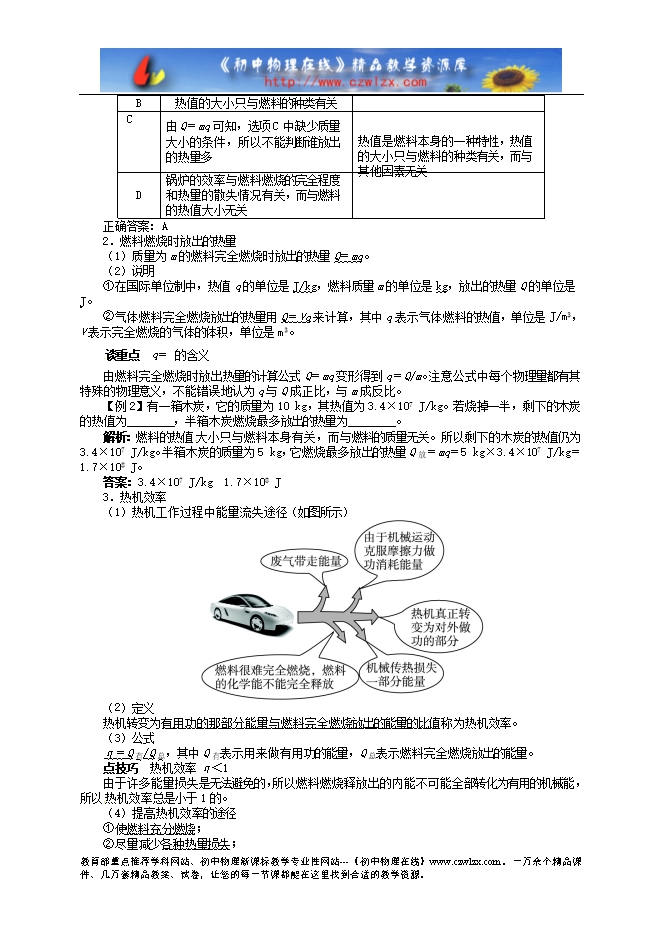 表示一定质量的燃料在完全燃烧时所放出热量的多少。如木炭的热值为3.40×107 J/kg,它表示1 kg的木炭完全燃烧放出的热量是3.40×107 J。同种燃料的热值相同,不同种燃料的热值一般不同。
