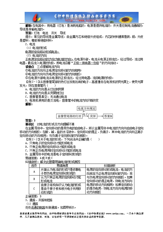 【例1】如图所示电路中,________是消耗电能的,________是提供电流的,________是控制电流通断的,________是传输电流的。