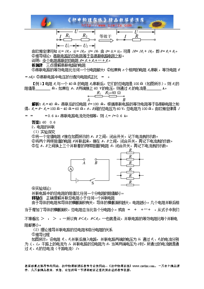 ②推导结论:串联电路的总电阻等于各串联电路电阻之和。