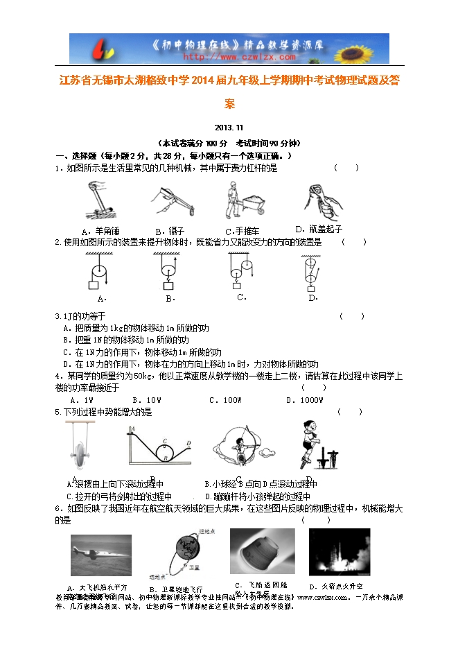 江苏省无锡市太湖格致中学2014届九年级上学期期中考试物理试题及答案