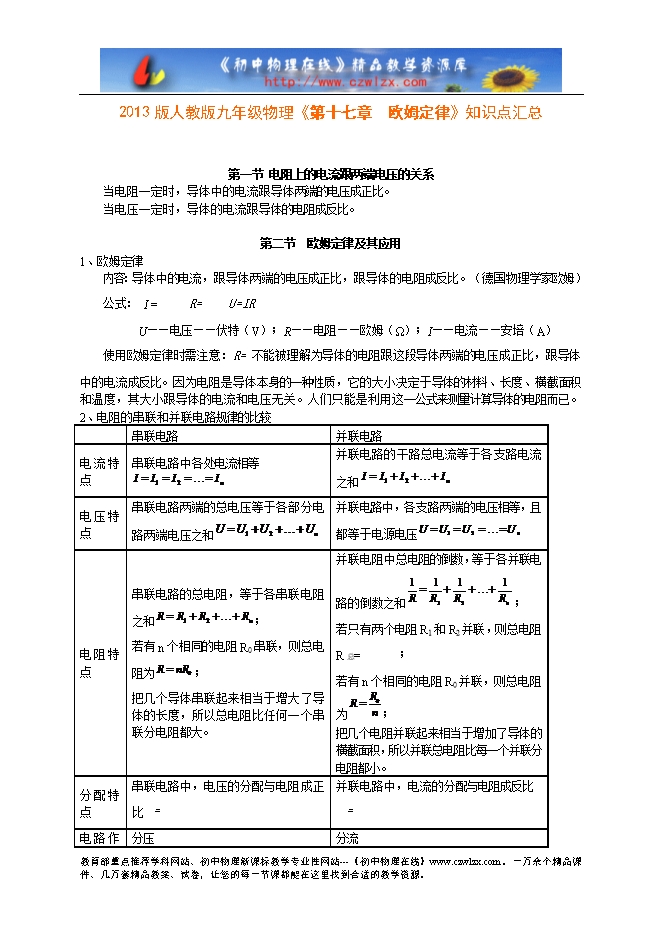 2013版人教版九年级物理《第十七章 欧姆定律》知识点汇总