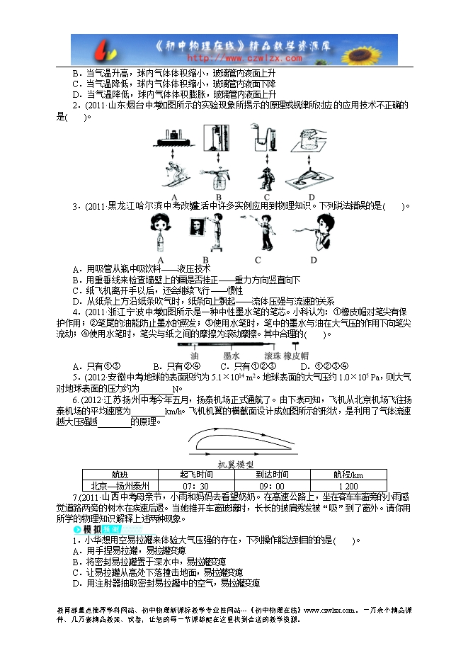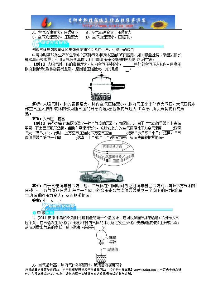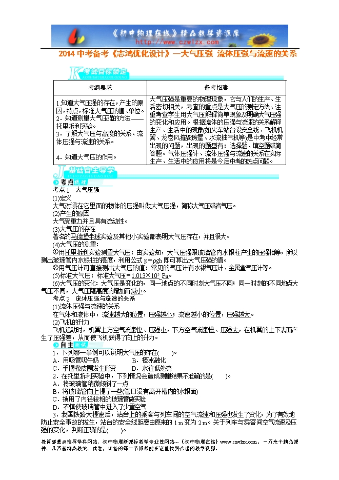 2014中考备考讲义《志鸿优化设计》--大气压强 流体压强与流速的关系