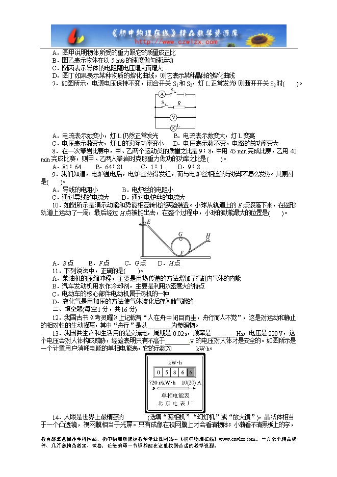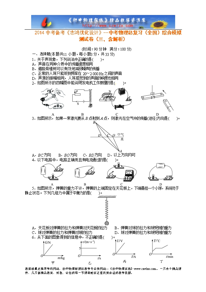 2014中考备考《志鸿优化设计》--中考物理总复习(全国)综合模拟测试卷(三,含解析)
