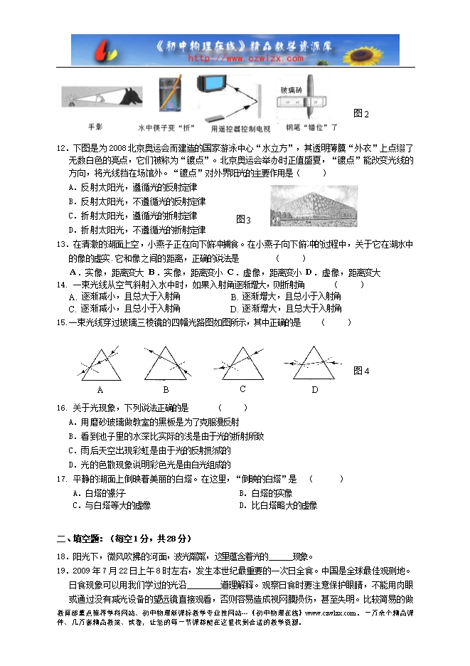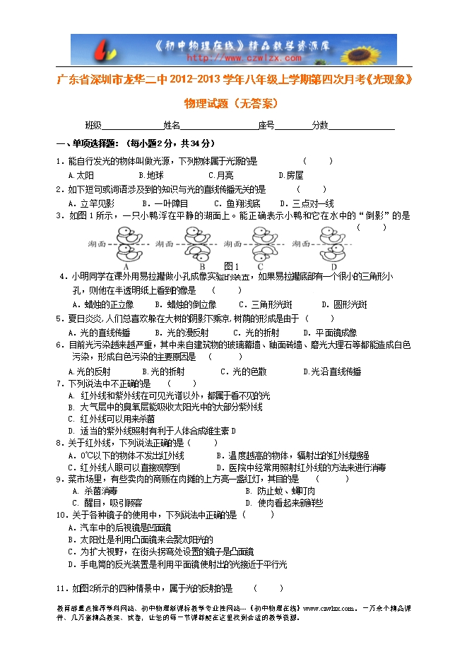 广东省深圳市龙华二中2012-2013学年八年级上学期第四次月考《光现象》物理试题(无答案)