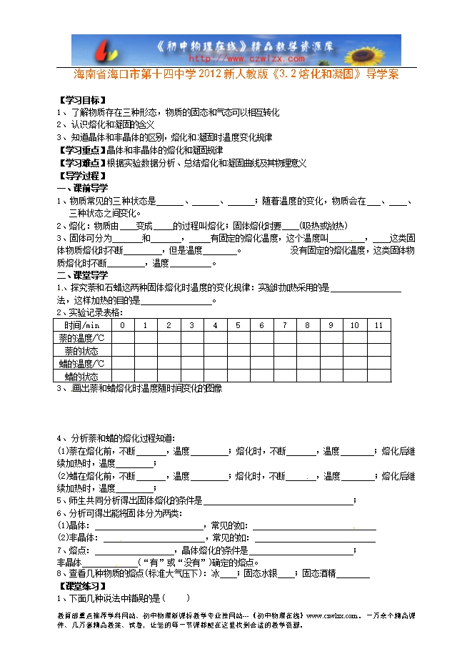 海南省海口市第十四中学2012新人教版《3.2熔化和凝固》导学案