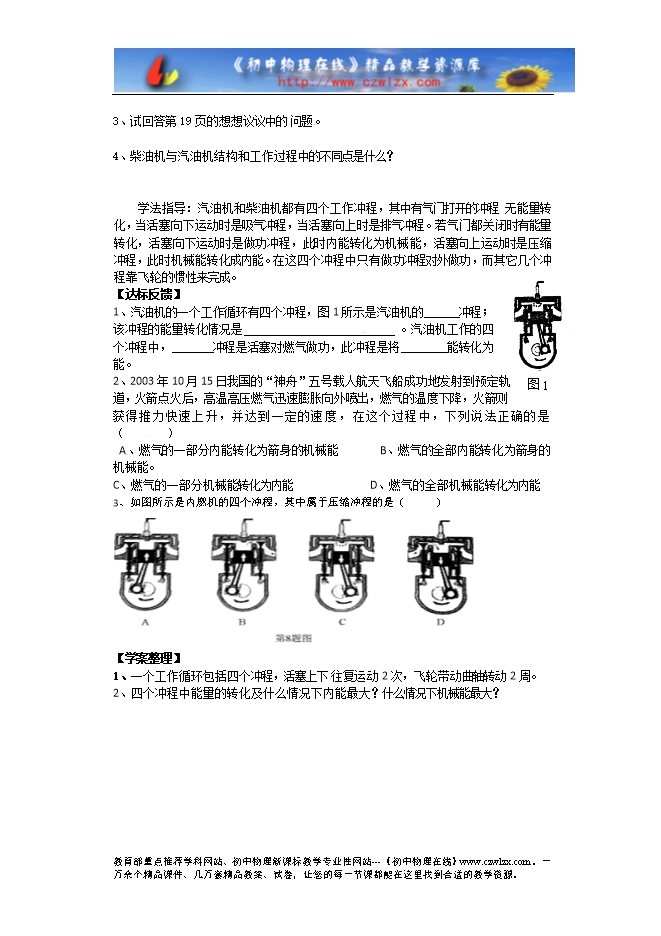 2、了解四冲程汽油机、柴油机的基本结构和 工作原理。
