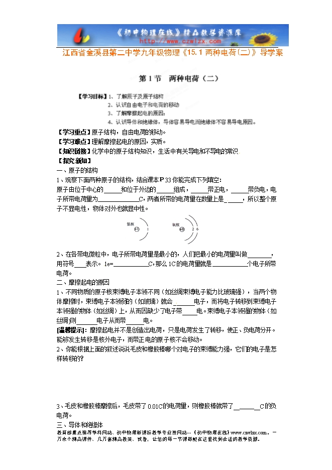 江西省金溪县第二中学九年级物理《15.1两种电荷(二)》导学案