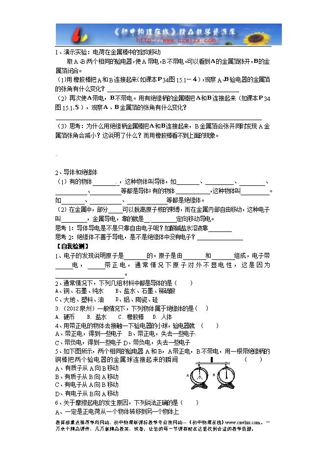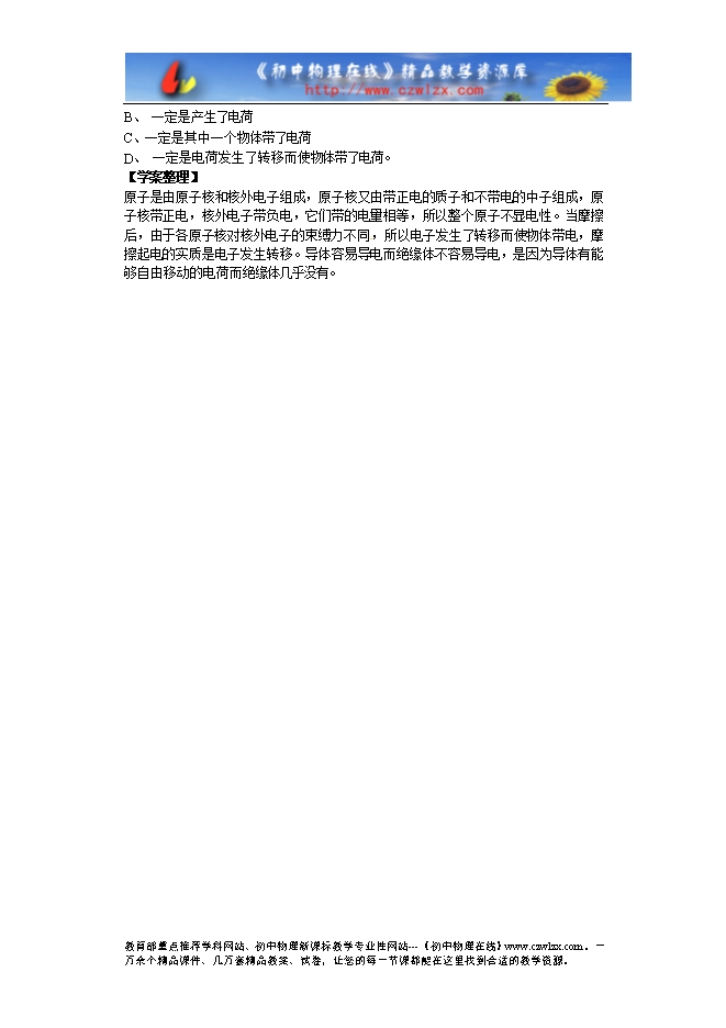 [温馨提示]:摩擦起电并不是创造出电荷,只是电荷发生了转移,使正、负电荷分开。能够发生转移是核外电子,而带正 电的原 子核不会移动。