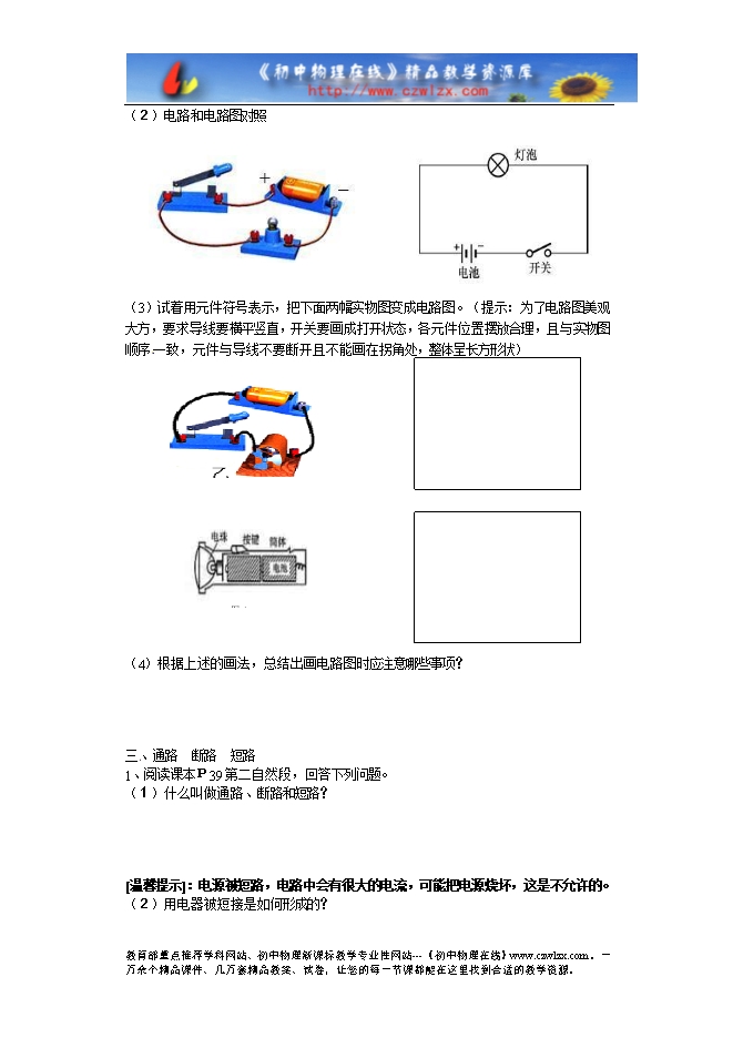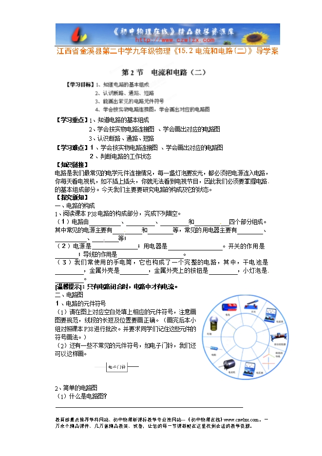 1、阅读课本P38电路的构成部分,完成下列填空。