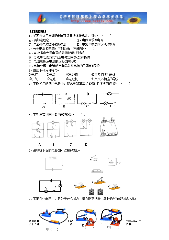 电路是我们最常见的电学元 件连接情况,每一盏灯泡要发光,都必须把电源连入电路,你每天看电视机,如不插上插头,你就无法看到电视节目,因此我们必须要掌握电路 的基本组成部分。今天我们主要要研究电路的构成及它的状态。