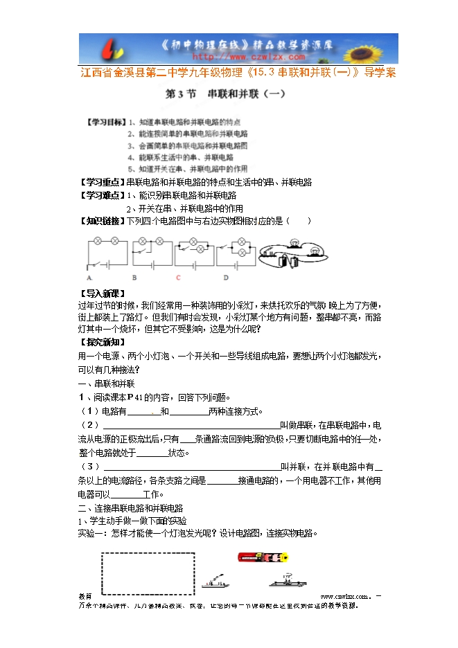 江西省金溪县第二中学九年级物理《15.3串联和并联(一)》导学案