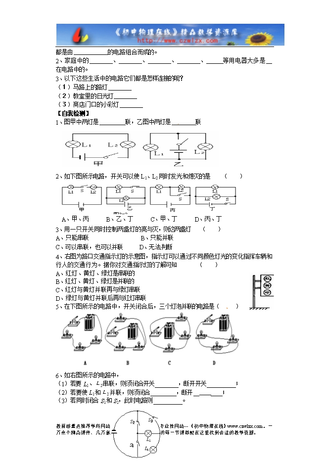 (2) 叫做串联,在串联电路中,电流从电源的正极流出后,只有 条通路流回到电源的负极,只要切断电路中的任一处, 整个电路就处于 状态。