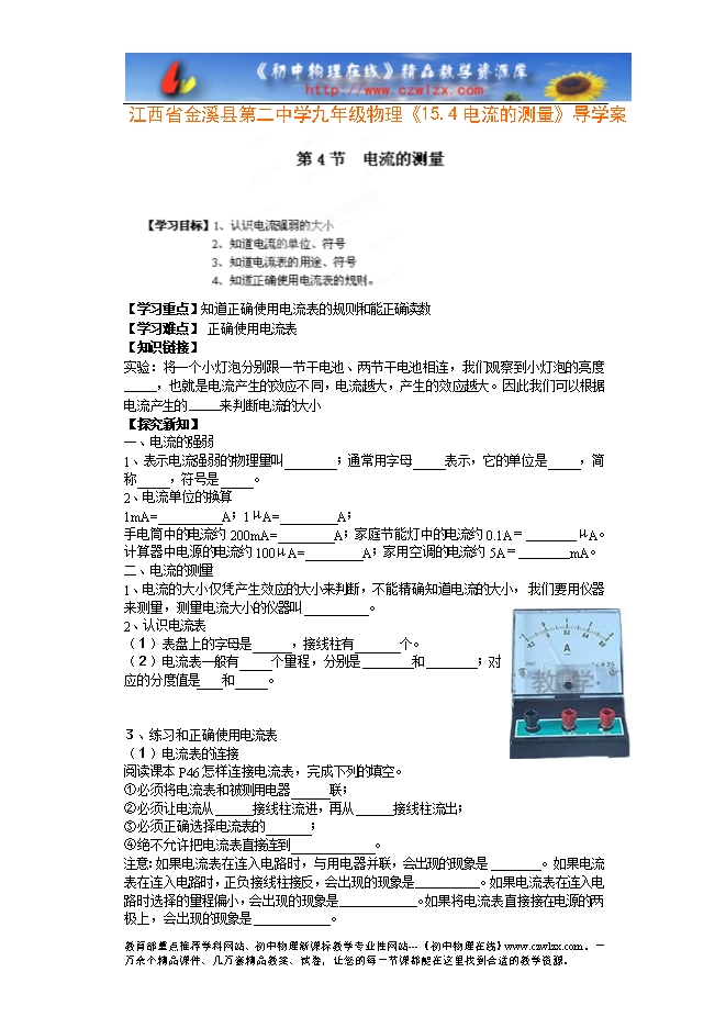 江西省金溪县第二中学九年级物理《15.4电流的测量》导学案