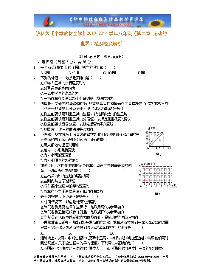 沪科版【中学教材全解】2013-2014学年八年级《第二章 运动的世界》检测题及解析