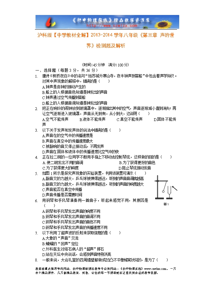 沪科版【中学教材全解】2013-2014学年八年级《第三章 声的世界》检测题及解析