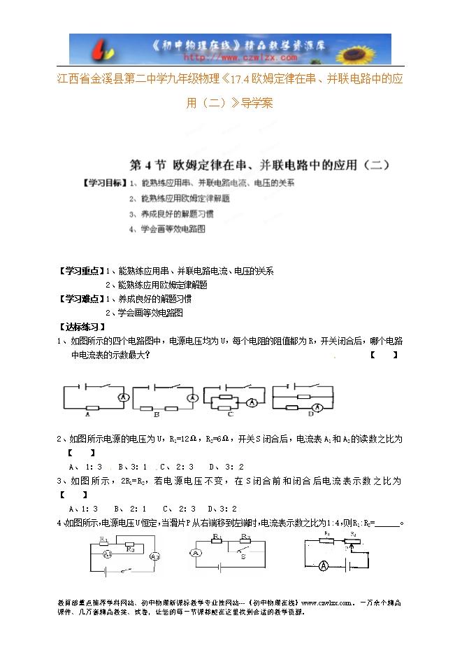 江西省金溪县第二中学九年级物理《17.4欧姆定律在串、并联电路中的应用(二)》导学案