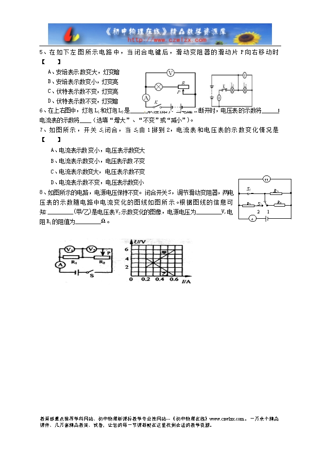 5、在如下左 图所示电路中,当闭合电键后,滑动变阻器的滑动片P向右移动时 【 】