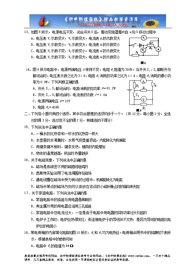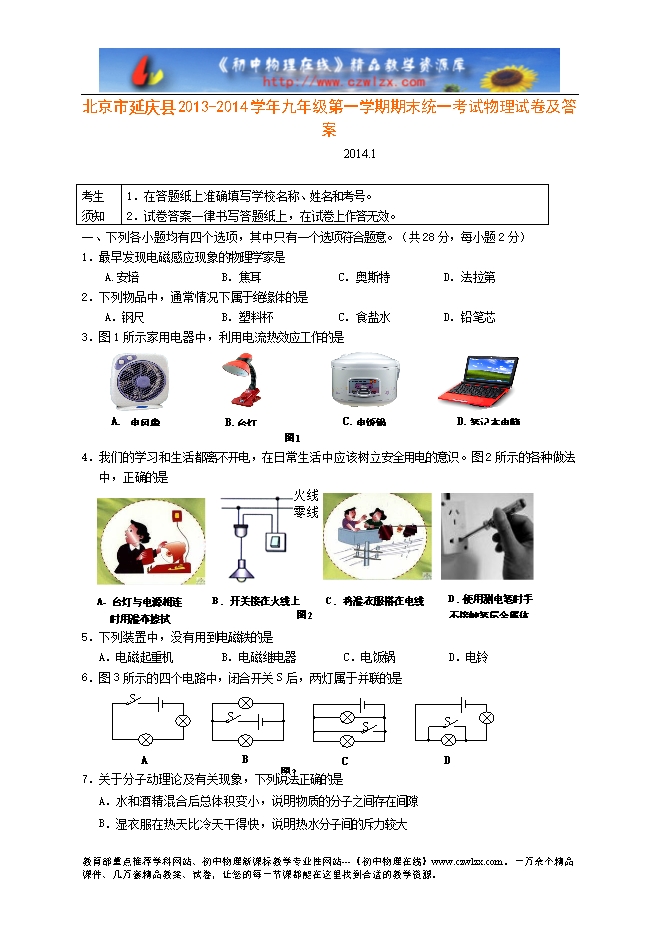 北京市延庆县2013-2014学年九年级第一学期期末统一考试物理试卷及答案