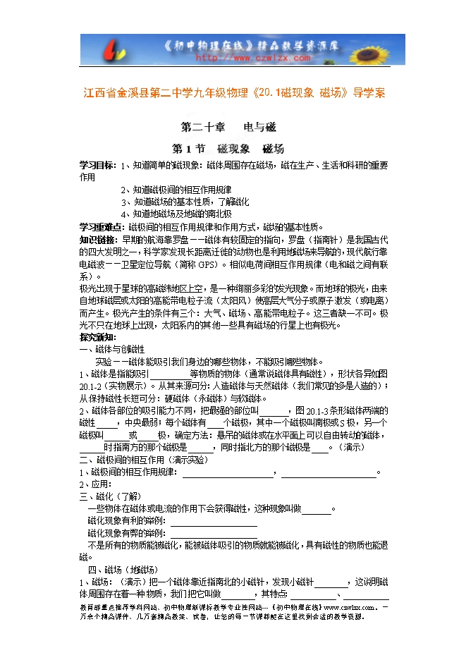 江西省金溪县第二中学九年级物理《20.1磁现象 磁场》导学案
